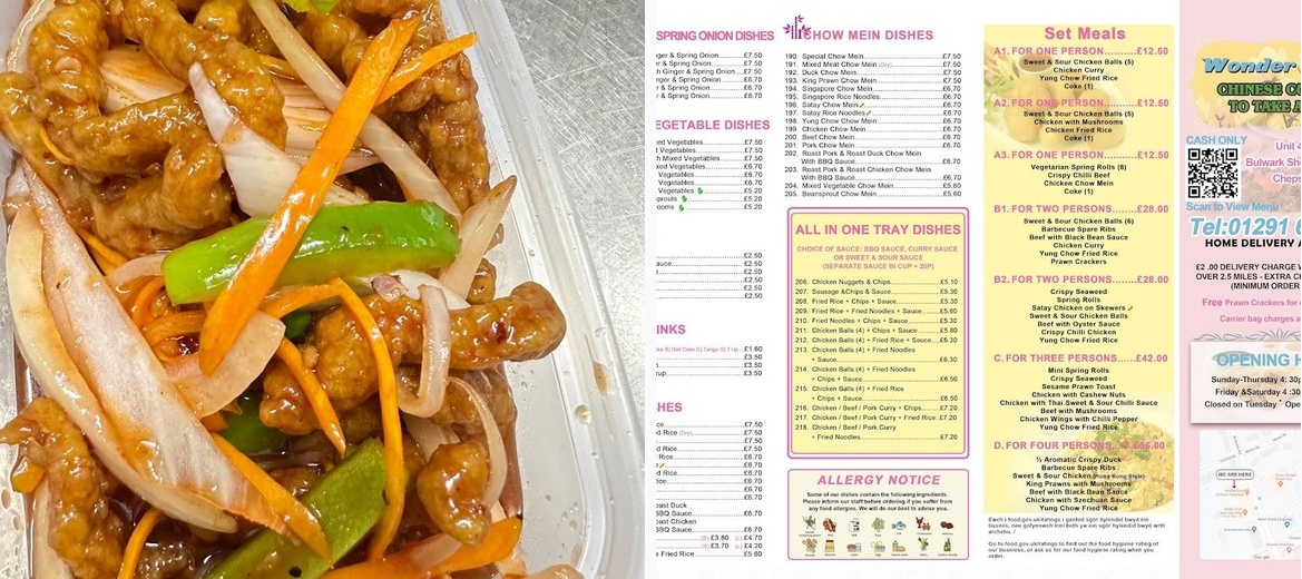 Welcome to Wonderfood Chinese Takeaway, your go-to destination for delicious, authentic Chinese cuisine in Bulwark, Chepstow. Our extensive menu features beloved classics and innovative dishes, perfect for a late-night bite or a cozy family meal. We pride ourselves on our quick service, friendly staff, and generous portions at pocket-friendly prices. With no-contact delivery and takeaway options, enjoying your favorites has never been easier. Our casual atmosphere and wheelchair-accessible entrance make it ideal for everyone, including kids! Whether you’re dining in or taking out, Wonderfood is here to satisfy your cravings while ensuring a memorable dining experience.The generous portion sizes have patrons raving about their meals, making every dish feel like a feast. Many love the set meal for four, often praised for its value and taste, serving as a delightful experience filled with hot and fresh flavors. The salt and pepper chips remain a standout favorite, with countless reviews highlighting their crispy texture and addictive flavor. Customers consistently commend the friendly staff, noting how their warmth enhances the overall dining experience. Also, the late-night delivery service opens up a world of options for night owls, making it a unique offering in the area. Wonderfood captures the heart of takeaway dining, combining quality, taste, and a welcoming atmosphere.